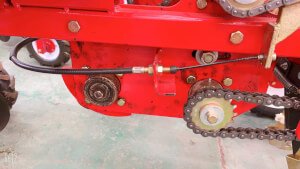 Power from the tractor’s PTO travels through the gearbox to the dual-crank main shaft of the planting drive.